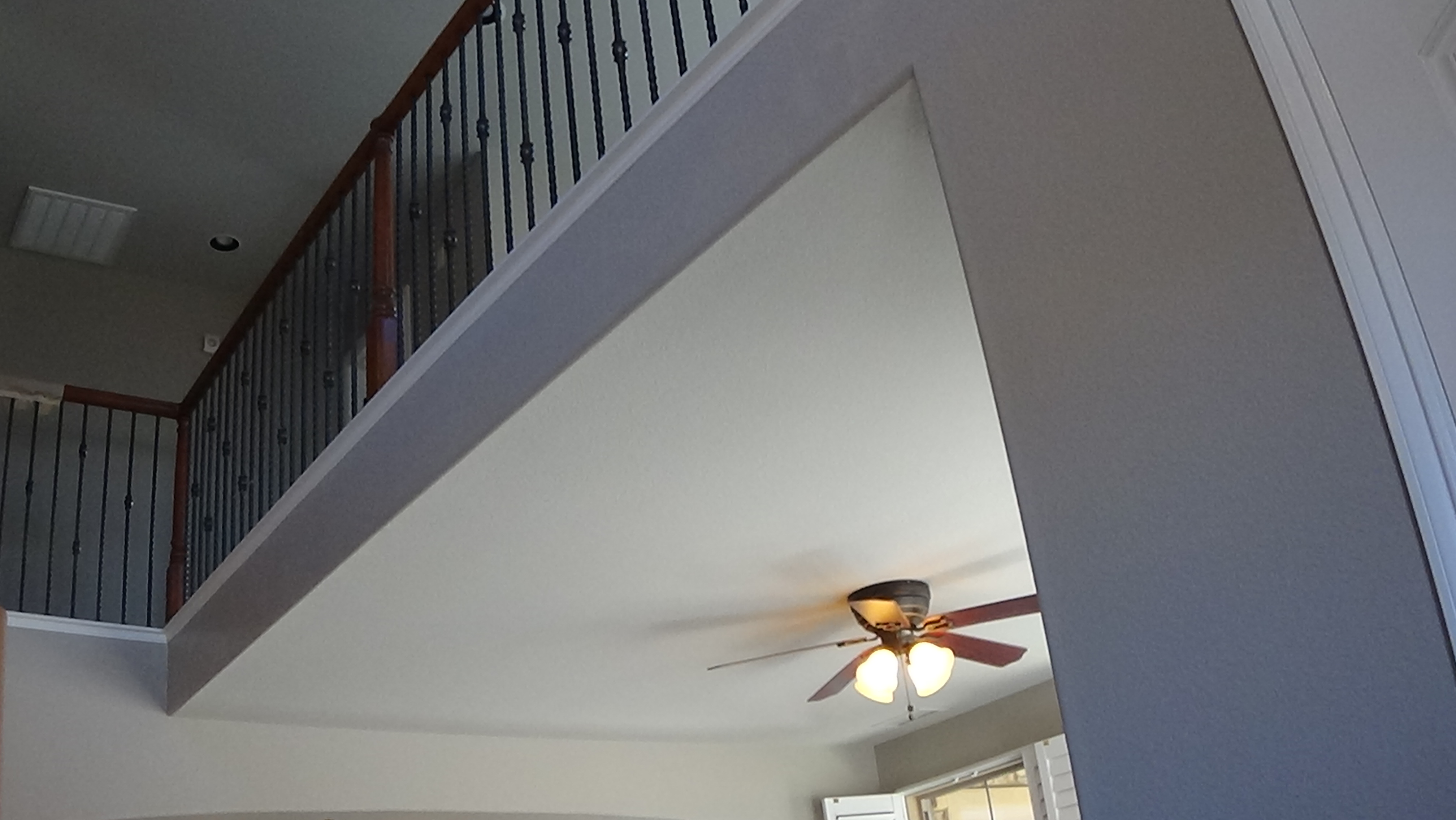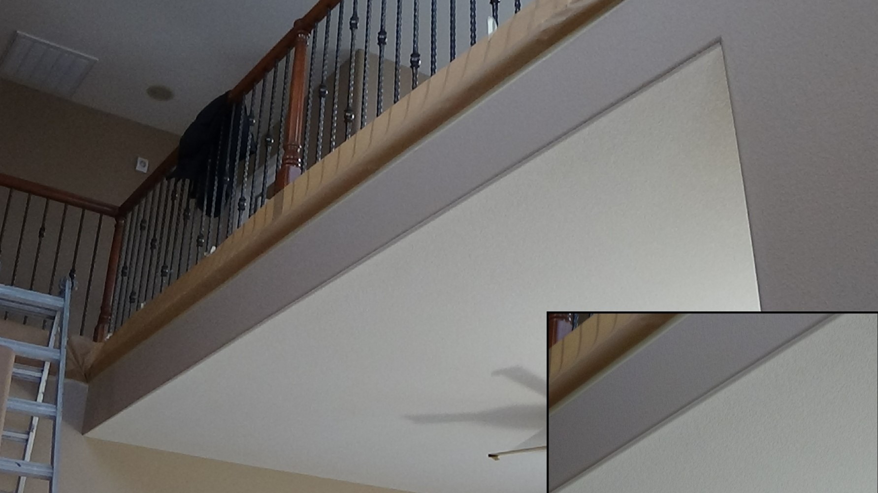 Ceiling lines on round corners are probably the hardest to get right, and look the worst when they’re done wrong. On square corners you simply paint to where the two walls meet; but what if the flat walls never touch? Many people, even professional painters, try to ‘split’ the curve, treating it like a square corner. The result is often a ‘paint’ line that doesn’t match the ‘light’ line. As we discussed in our post on walls, there are three parts, plus lighting, to take into account when painting bull-nose corners. We’re going to focus on the flat part of the ceiling and where it starts to transition into a curve. This will be were we make our new line.