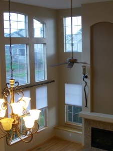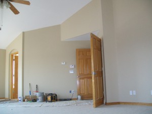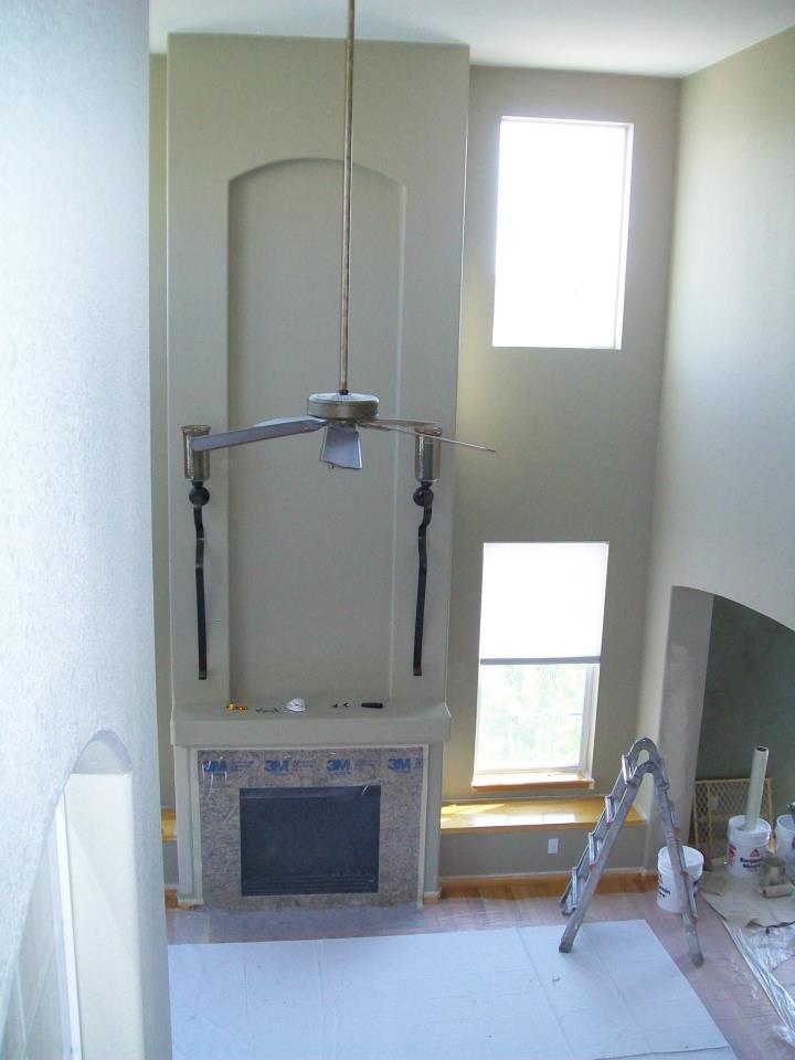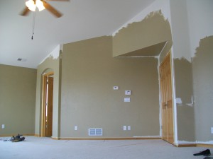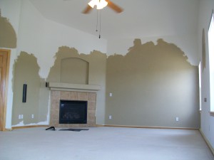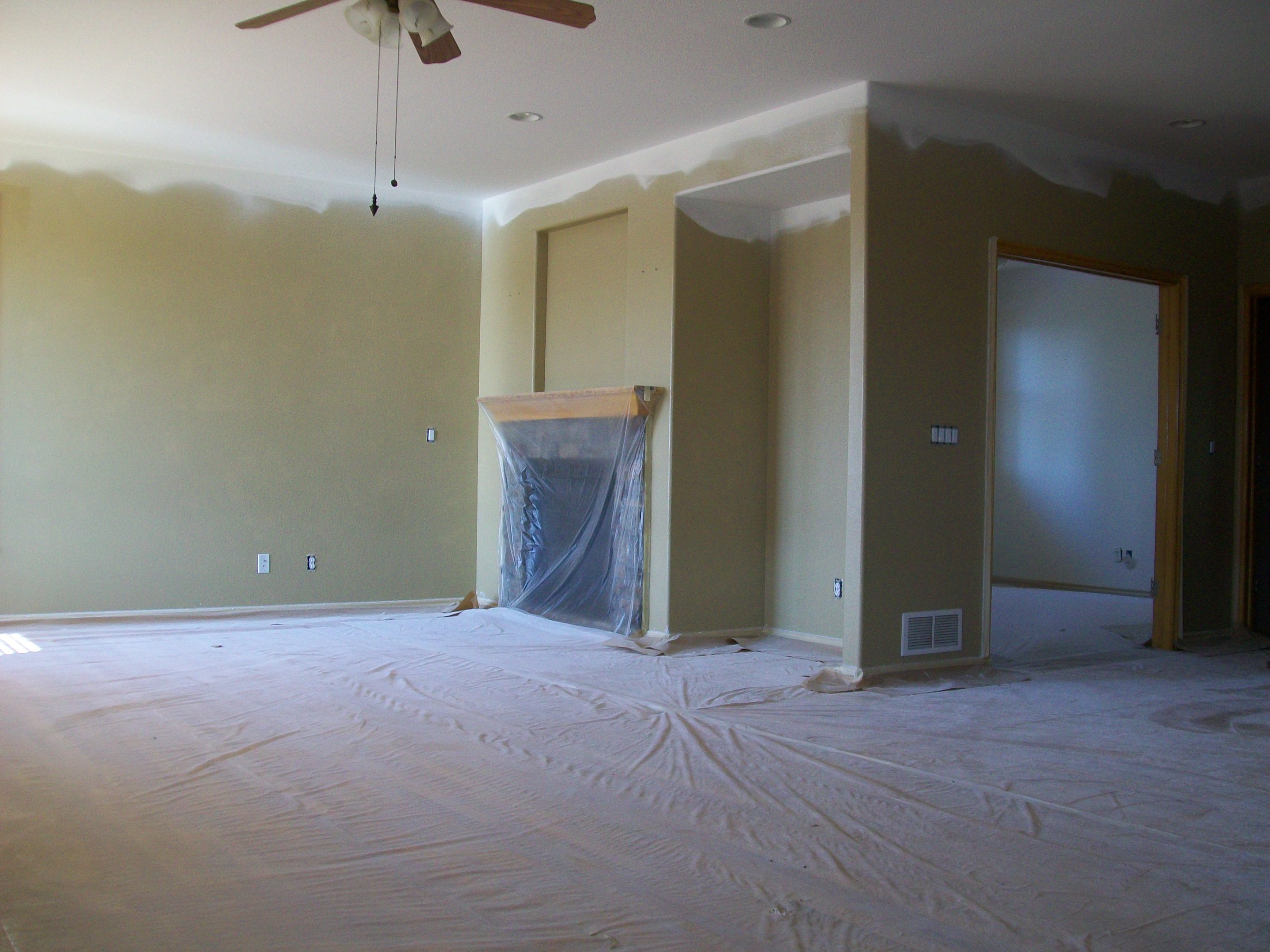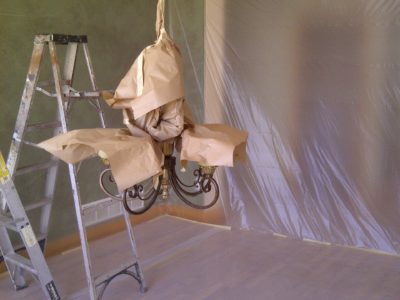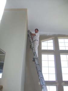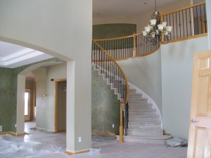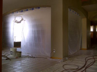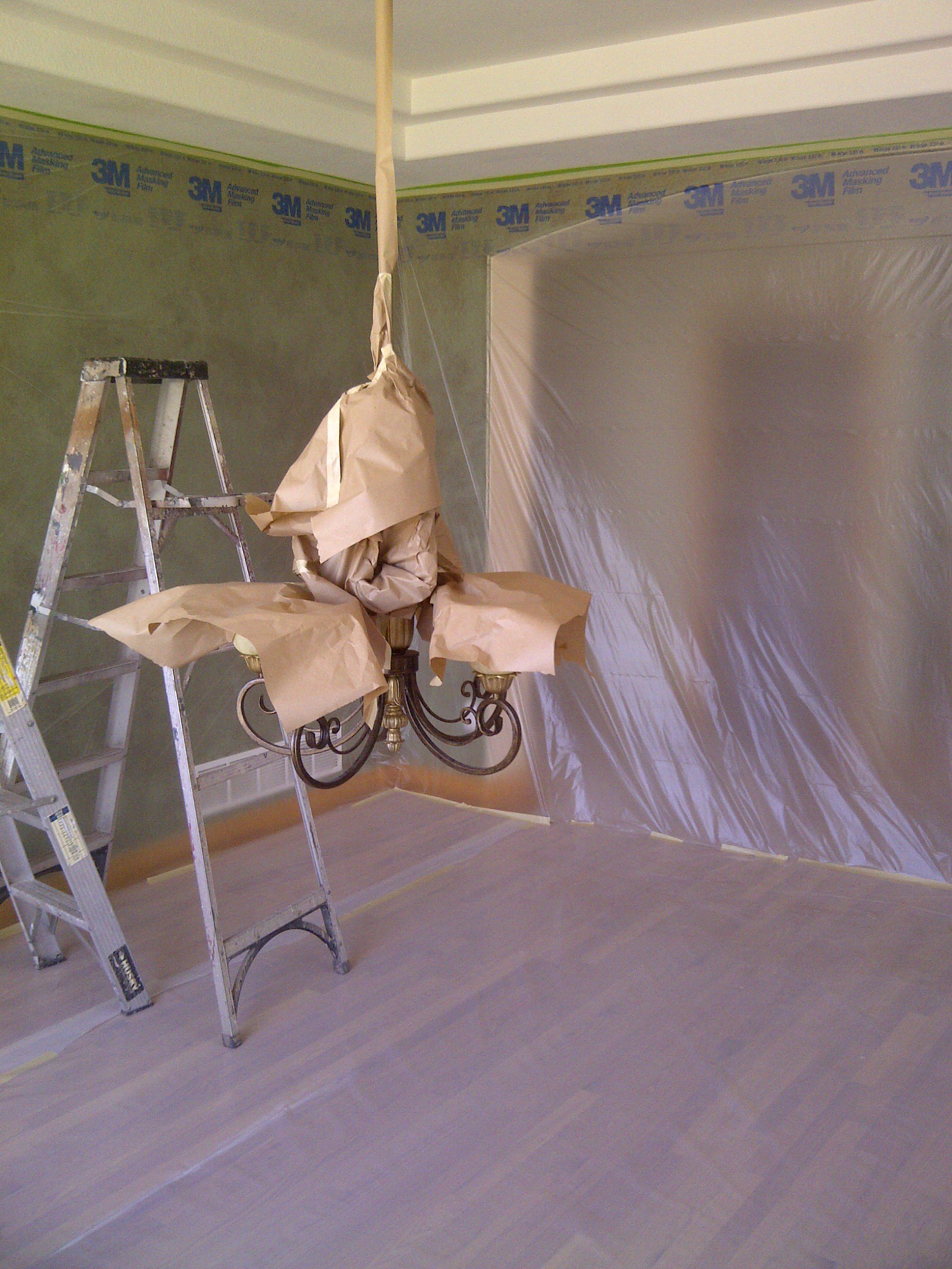 We had an interesting development during this project: Originally, the owners were undecided about leaving the dining room faux as an accent and didn’t decide to repaint it until all the walls in the living room and entry were already done. Since we needed to paint the ceiling to match the rest of the house before that, we decided to mask the dining room walls all the way to the floors. So here’s what we did: