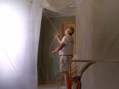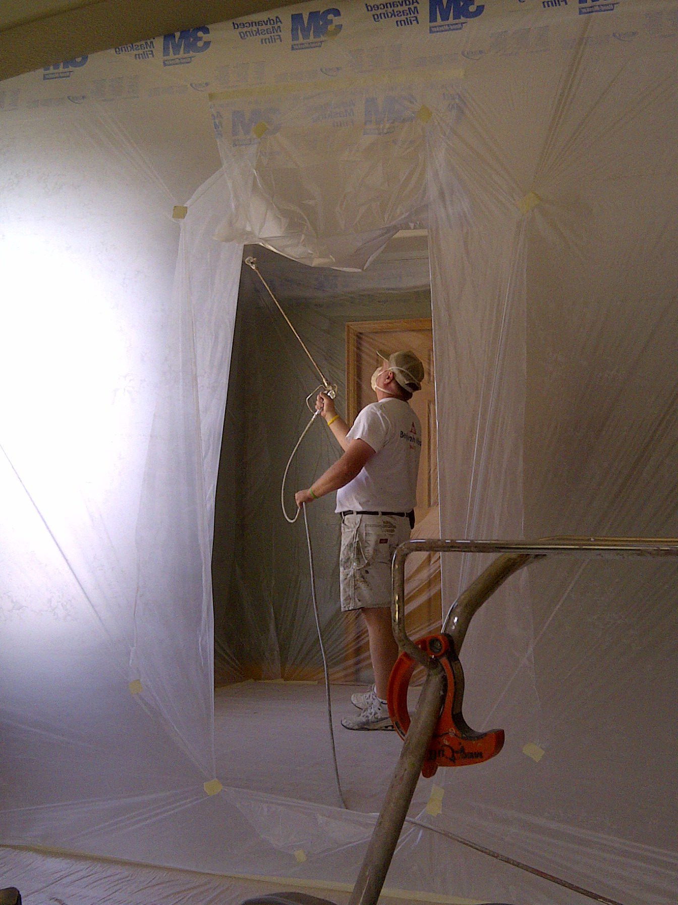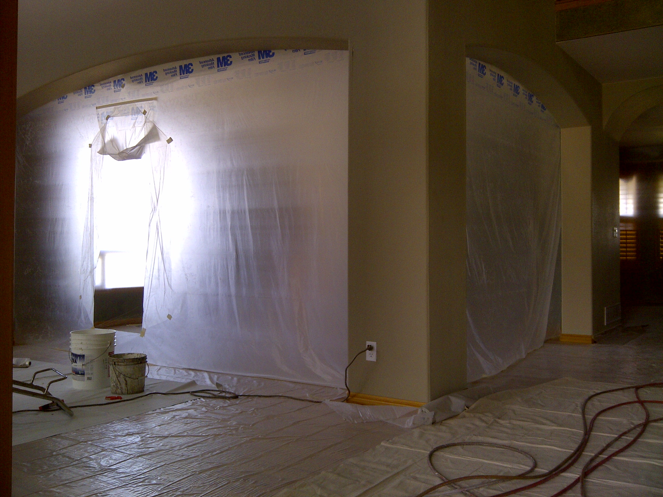 We taped the wall plastic to the floor plastic to avoid it blowing up during spraying.
