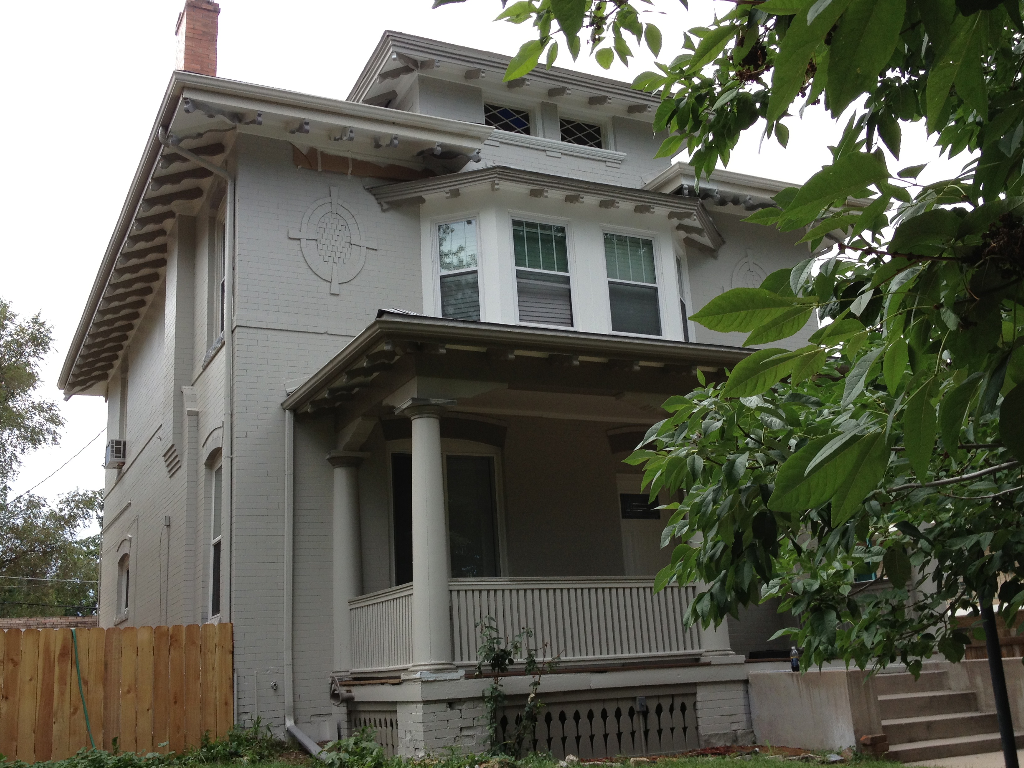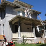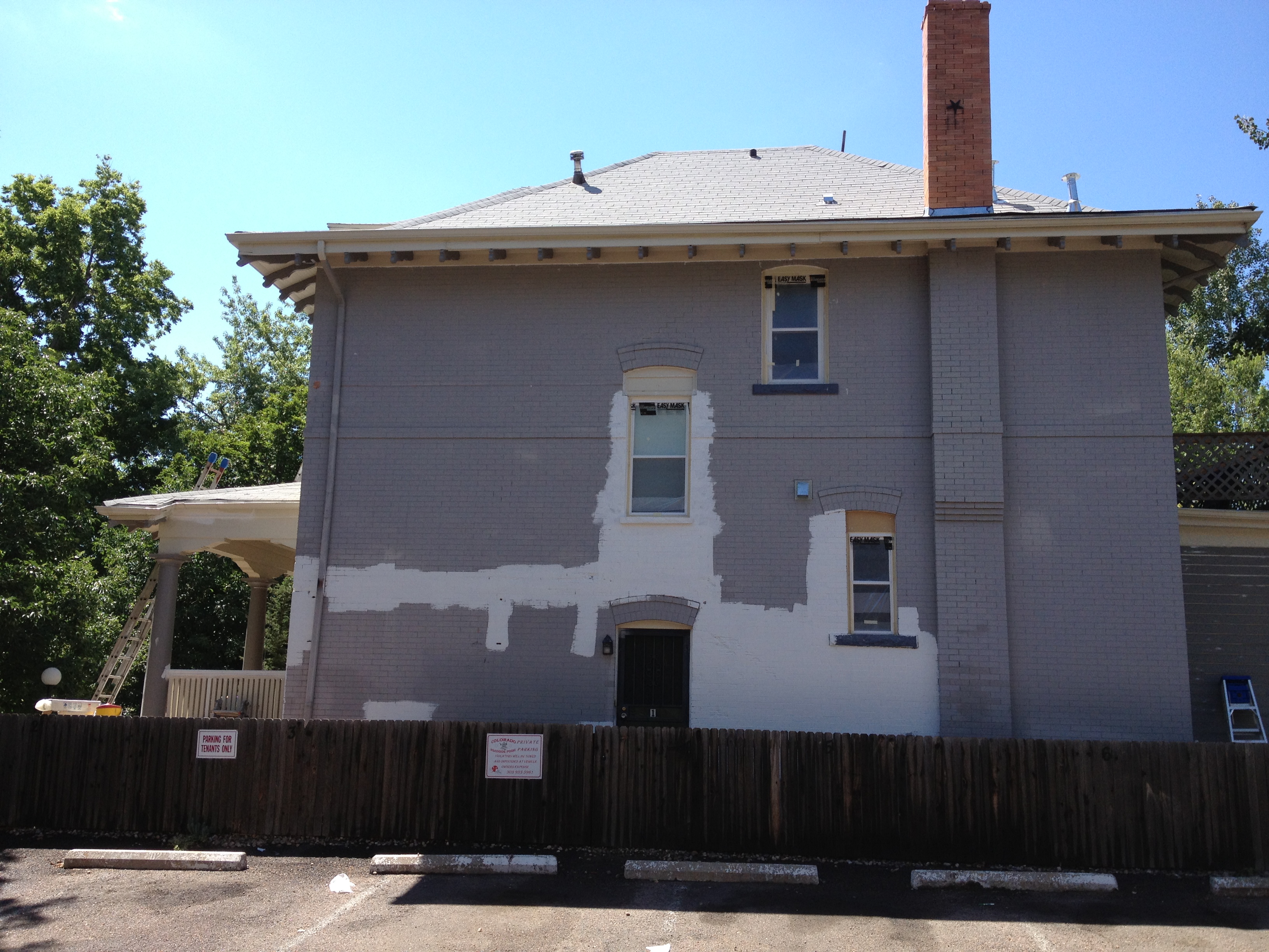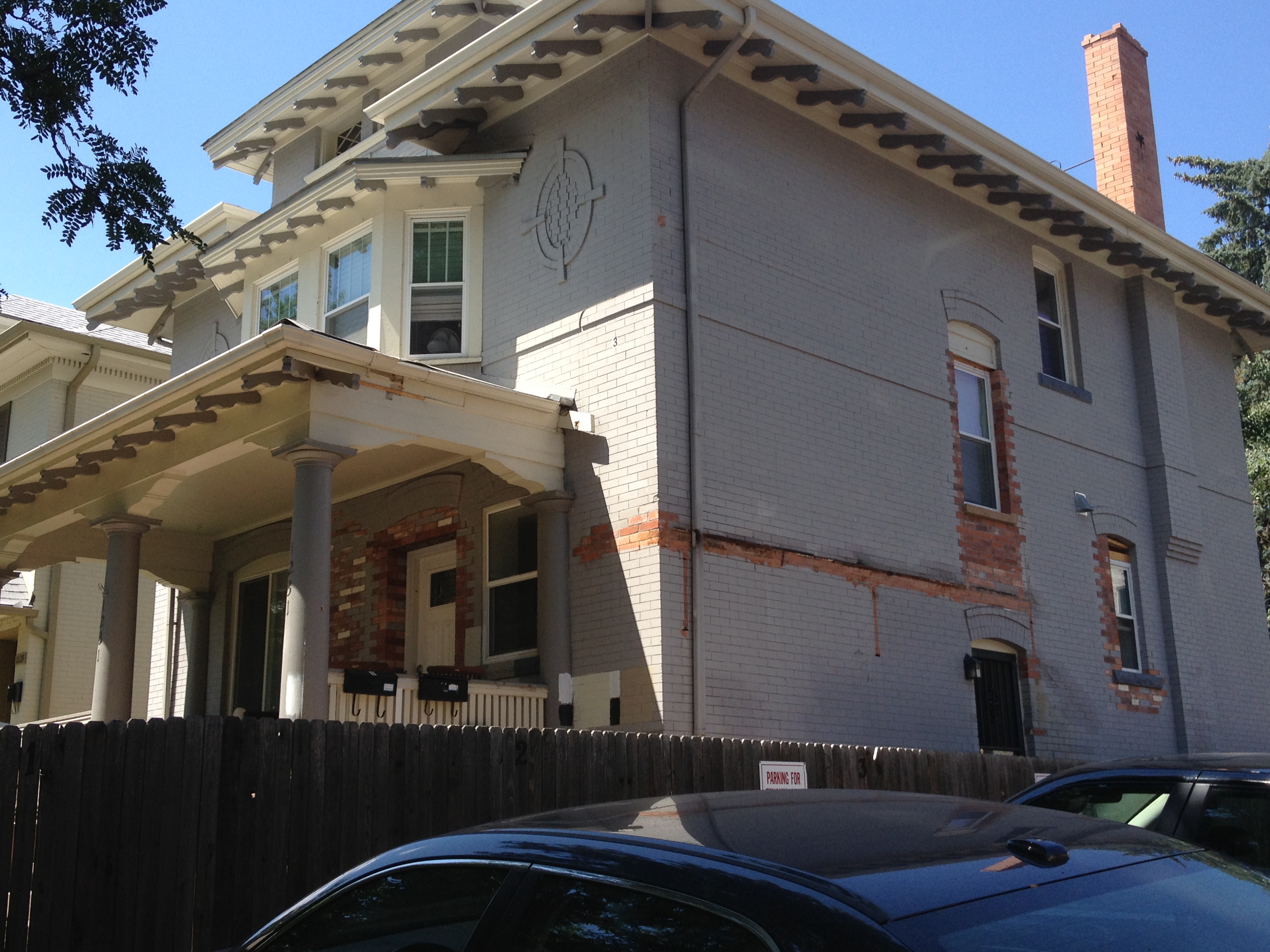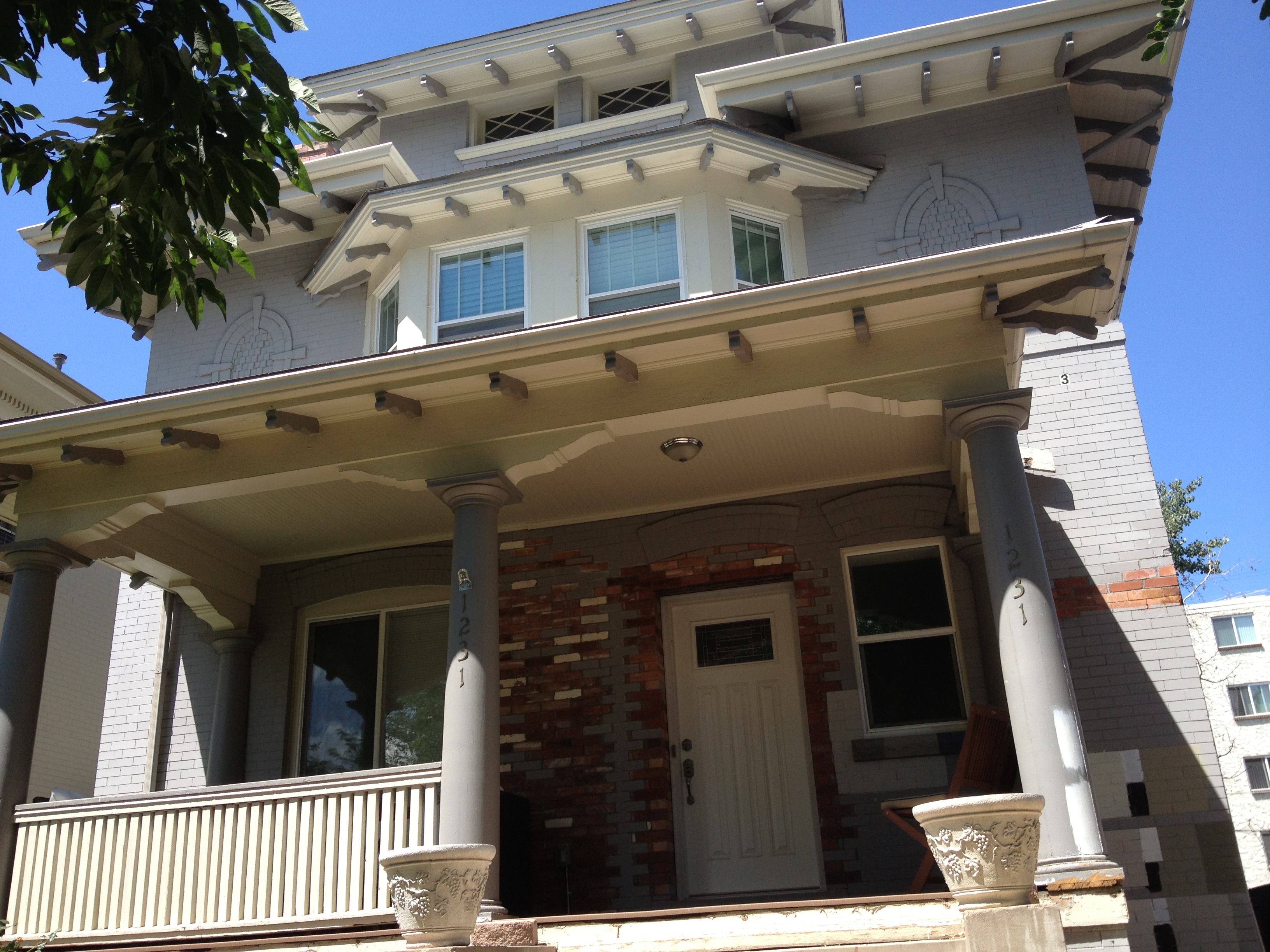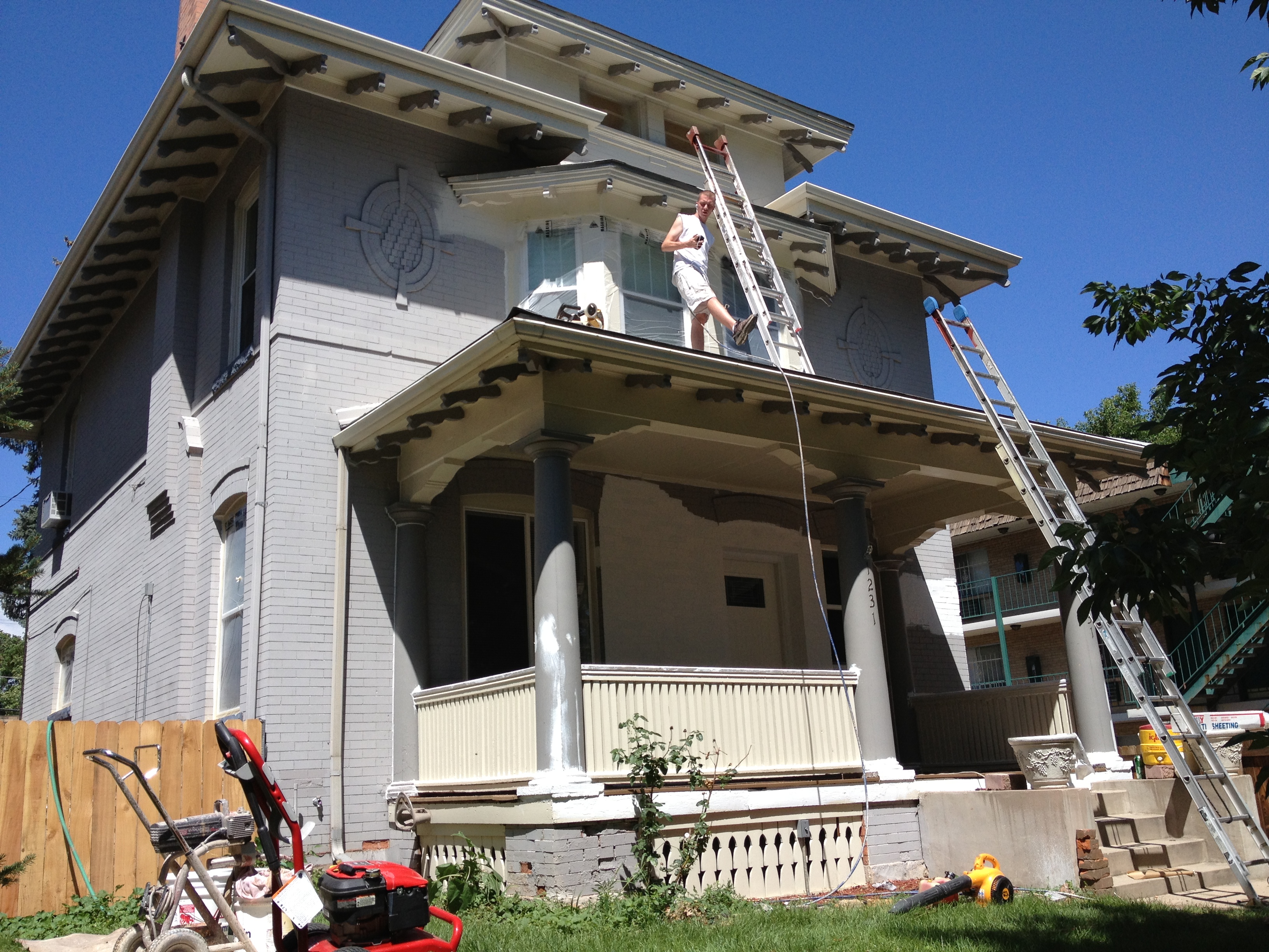 The historic Congress Park area of Denver has many beautiful turn-of-the-century homes that, over the years, were converted into multi-unit apartments. Usually, much of the architecture was kept intact as much as possible. Walls were added or torn down, doors were installed, plumbing had to be redone, but the main structure was the same. So it was with this lovely home. The owners were in the finishing stages of renovating this colossus back into a single-family dwelling from a four-plex. The inside was done, the brick work was complete and it was time for the HappyPainters to protect it for the decades to come.