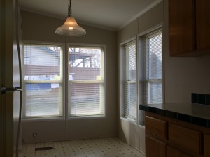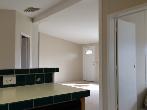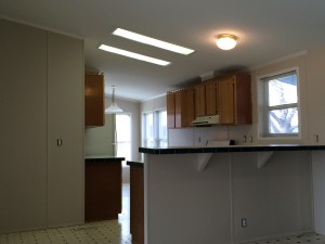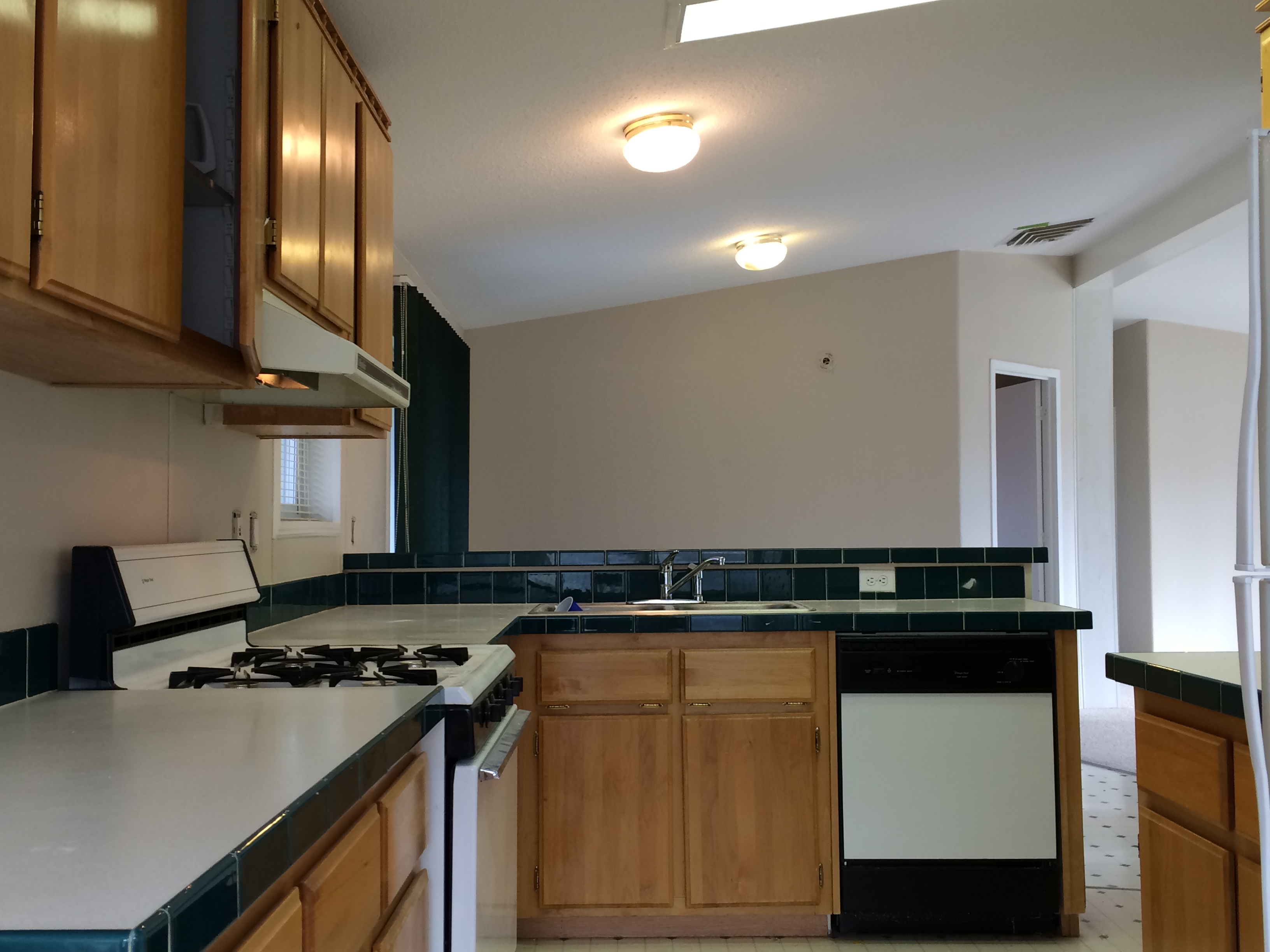It was decided we would update the overall look by going with ultra-white Benjamin Moore Muresco ceiling paint, white trim and Elmira white for the walls, which went great with the green tile in the kitchen. The results speak for themselves: