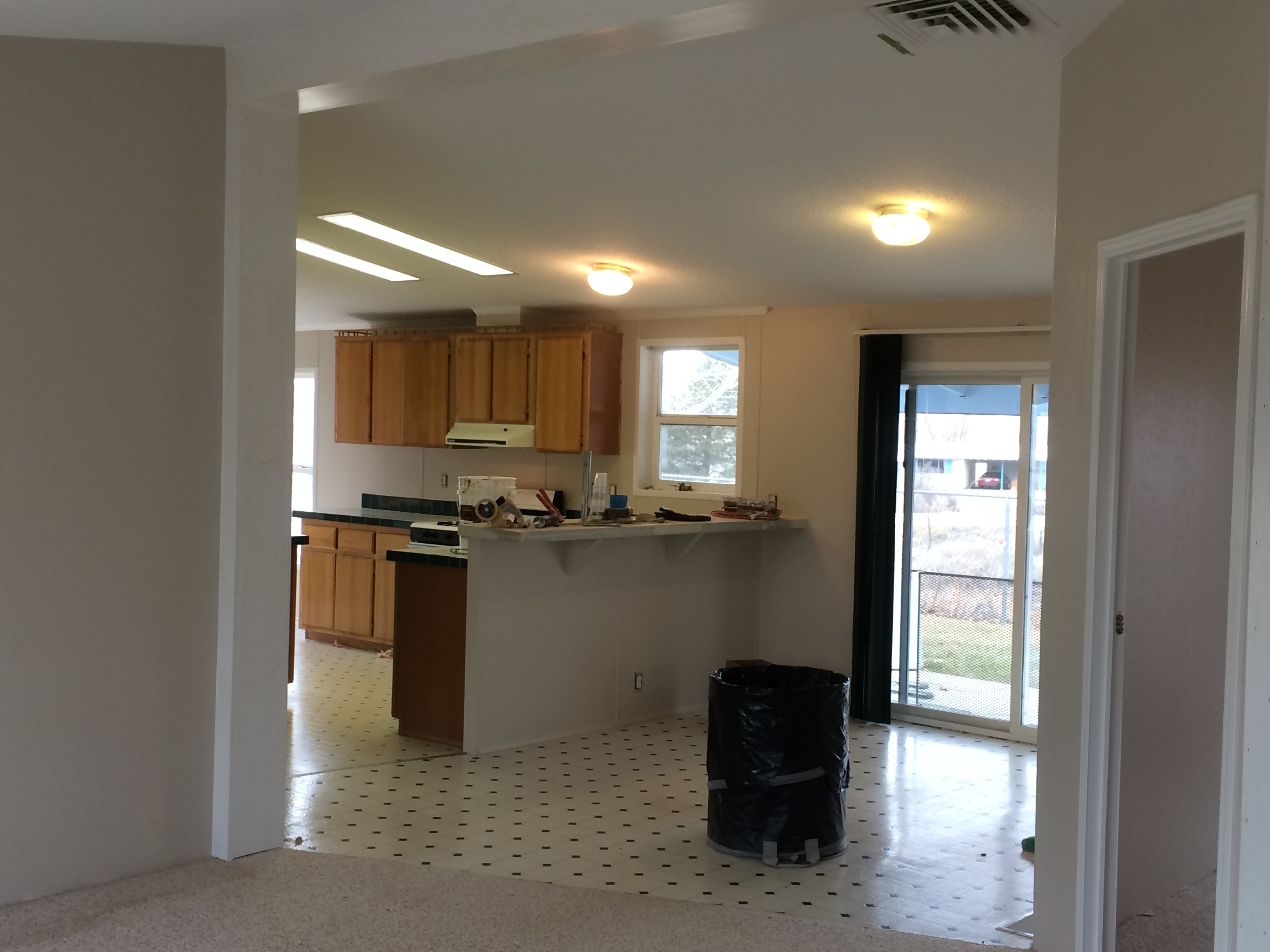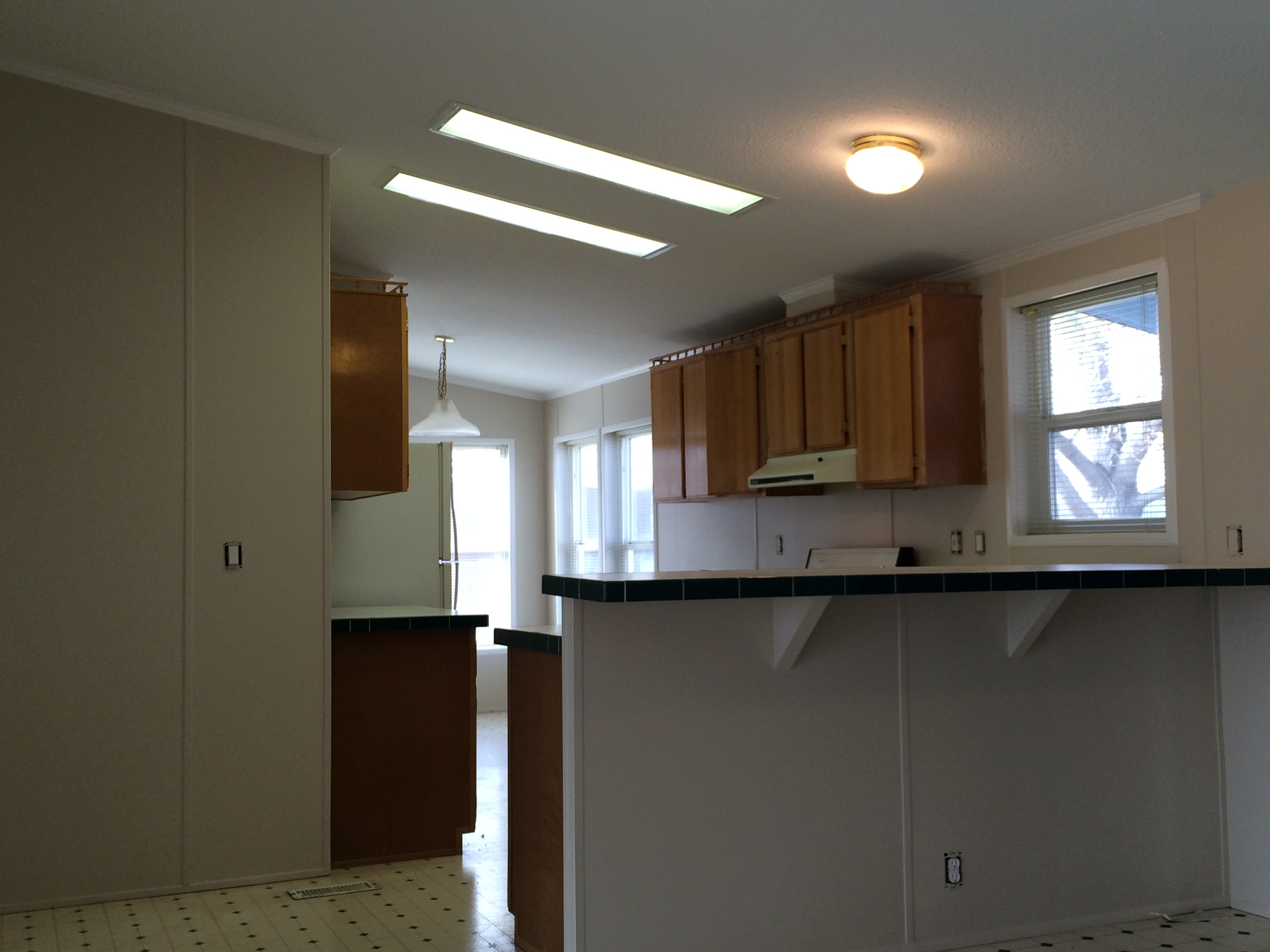 Some of the trim in windows and doors needed to be replaced and we caulked all the joints in the walls as well as all the trim to give it more of the feel of a site-built house; and we did our best to hide the unsightly natural-wood false beam that separated the living room from the dining area and kitchen,