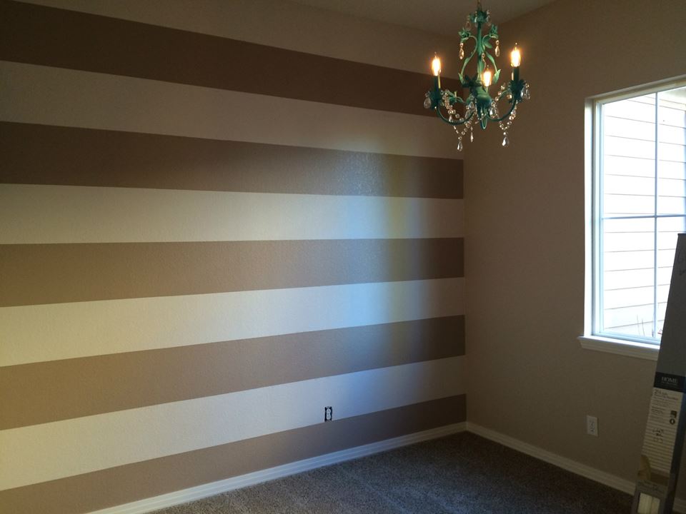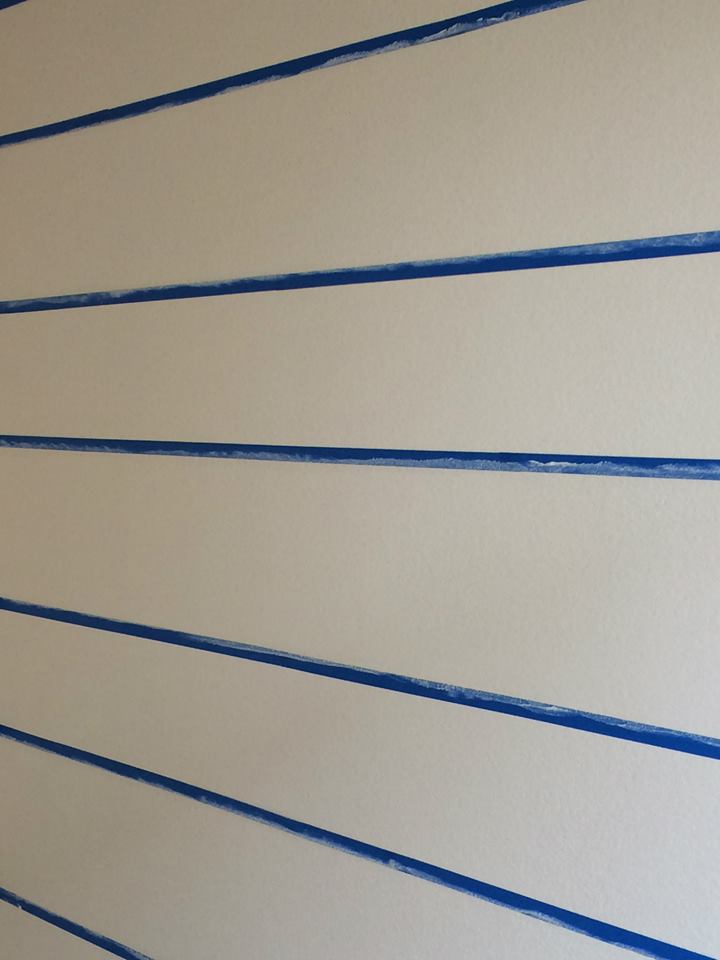 Start by determining your line width – we made 12-inch lines with the odd width at the bottom. Measuring down from around the same spot (your ceilings aren’t perfectly level), we followed our laser line with blue tape to minimize damage to the lighter base coat applied the day before. (Hint: make sure to run your tape on the outside of your stripes)