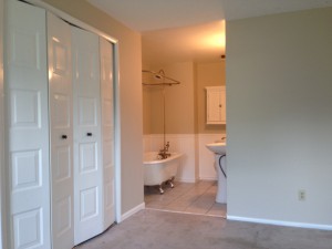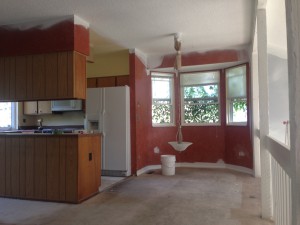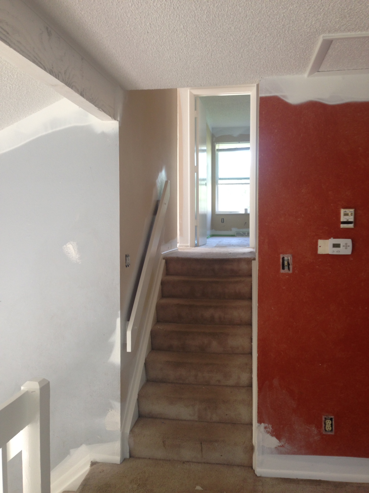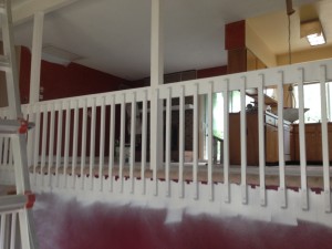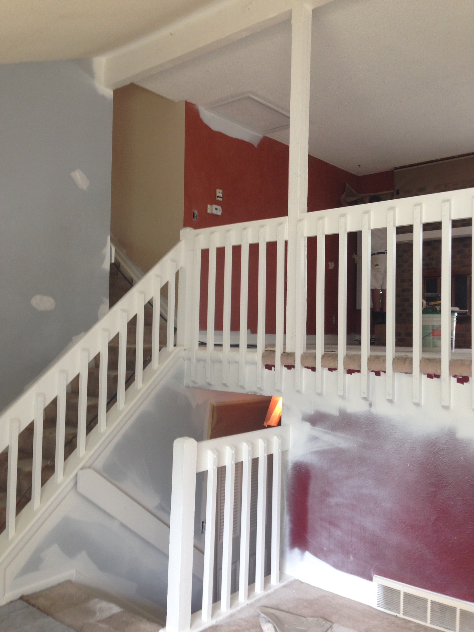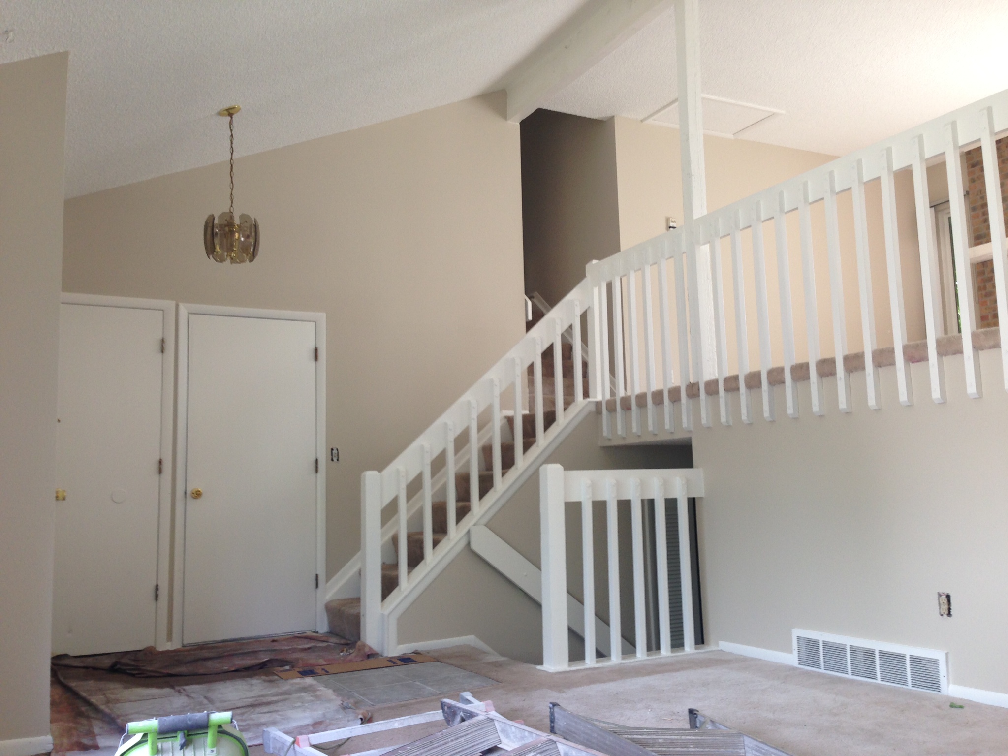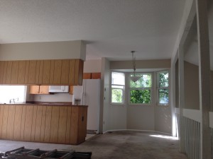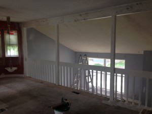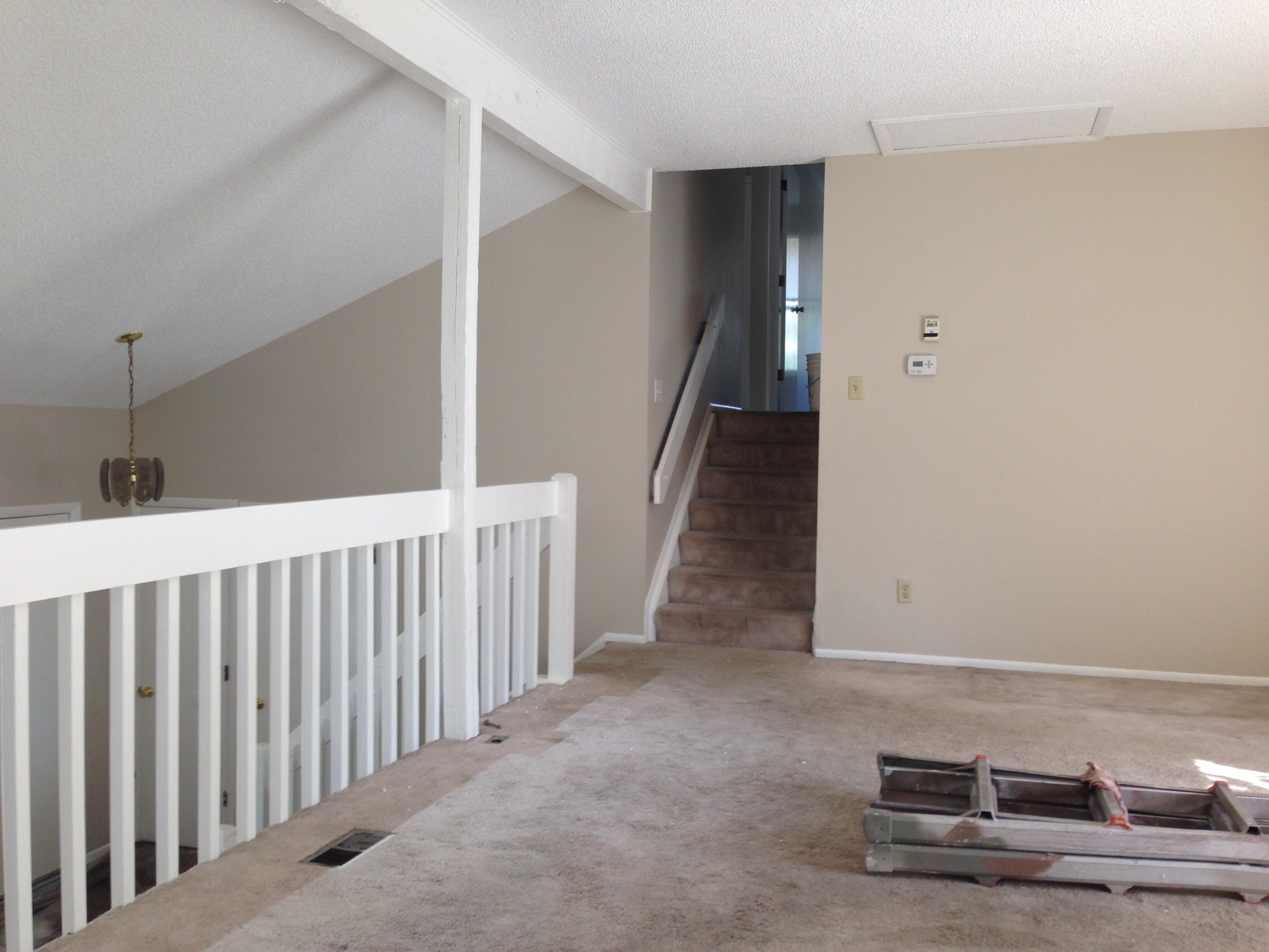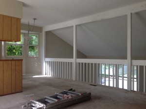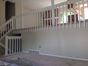 This multi-level was in desperate need of updating! We painted the dark beam and bannister trim-white. The ceiling we re-did in flat ceiling white with Benjamin Moore’s Elmira White (HC-84) on the walls. Getting rid of the dark colors and painting the ceiling really brightened the place up.