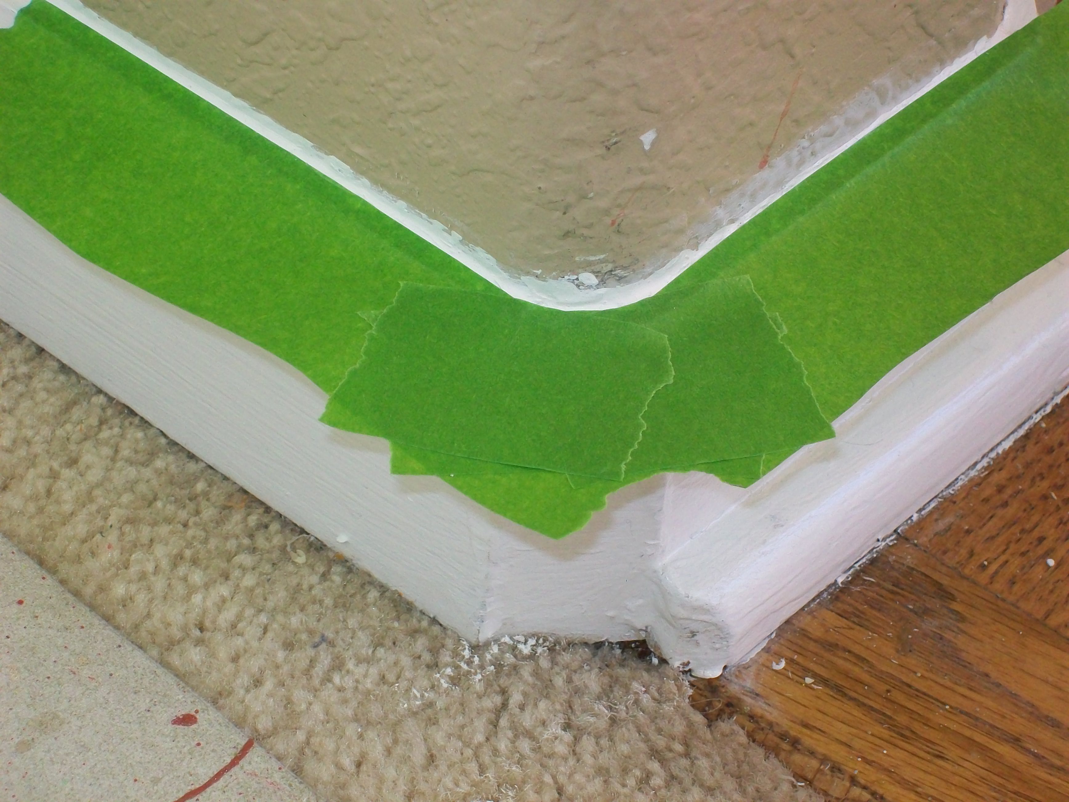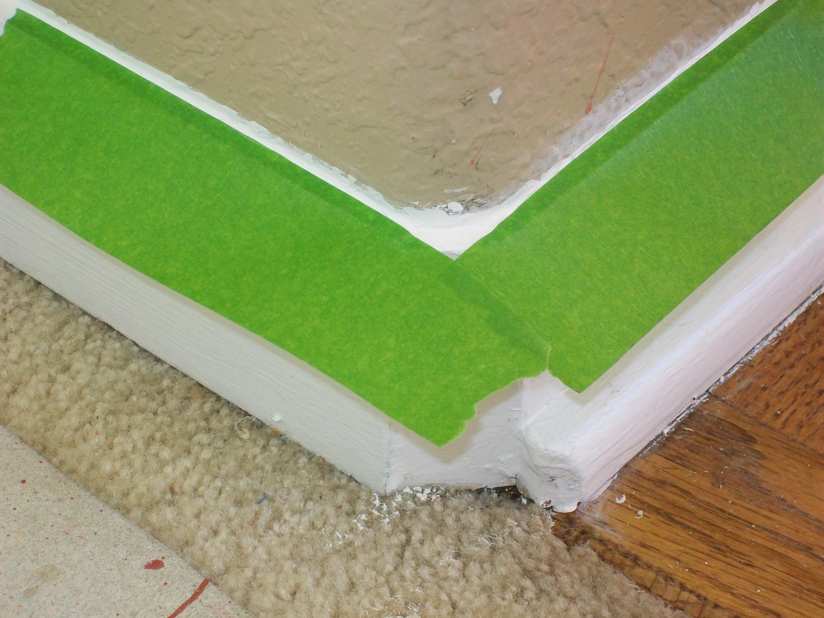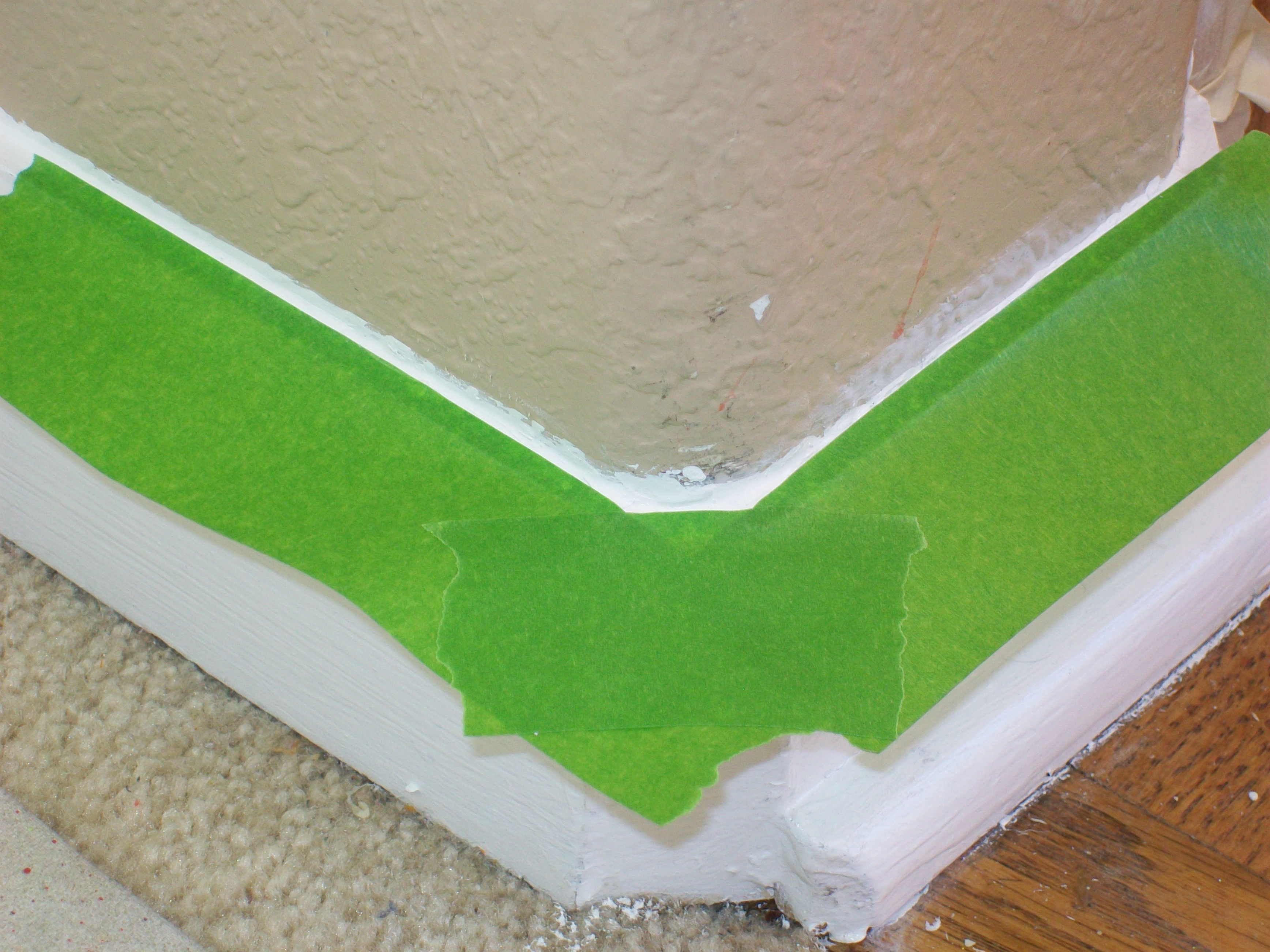First, if you plan to paint the trim and the walls, we suggest you paint the trim first. That way you can create the ‘ruler’ edge using the tape as your line. If you are not painting the baseboards clean them well so your tape will stick better and allow less ‘leaking’ of paint underneath the tape. We’ll be using pictures of baseboards we had just painted and let dry overnight. Since the paint is fresh, we chose not to use white masking tape, which can pull up the fresh trim paint when removed. Our tape-of-choice over new paint is Frog Tape – we find it leaves a better edge than traditional blue tape.