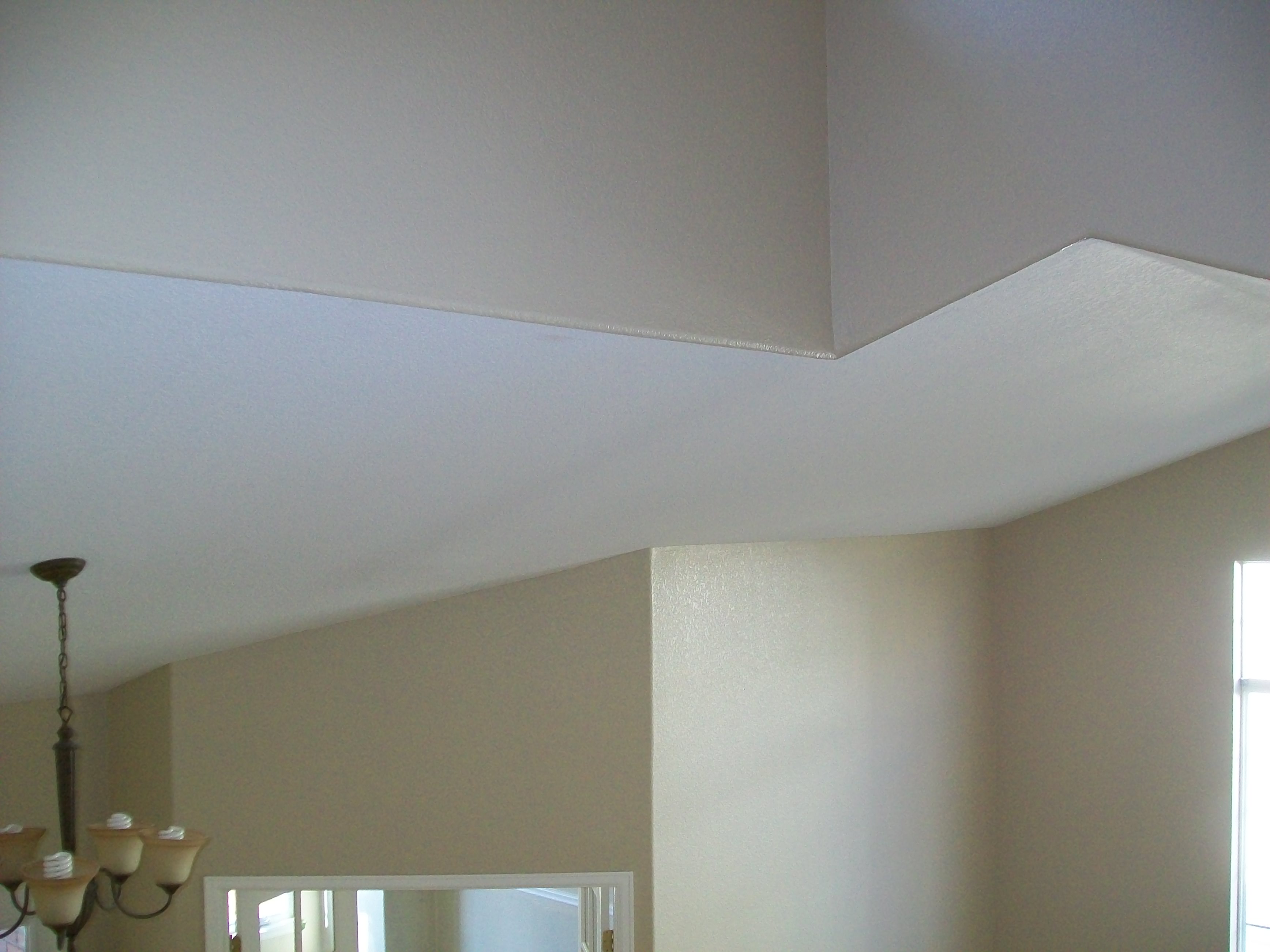 One of the most common mistakes we see – from homeowners and professionals alike – is trying to split the corner in two with the colors. On square corners this is how you differentiate between the two walls but on bull-nose corners there are actually three parts to the transition – the two walls plus the corner itself – and based on lighting and architecture your mind’s eye will automatically assign the bull-nose to one wall or the other. Take the above picture, for example: We painted the wall color around the corner to make it part of the wall. The outcome is a ceiling line that looks square on a rounded corner.